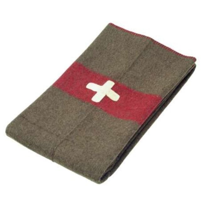 Diese Wolldecke ist braun und hat eine rote Umrandung mit einem weißen Kreuz darauf. Diese ist von der Schweizer Flagge abgeleitet.