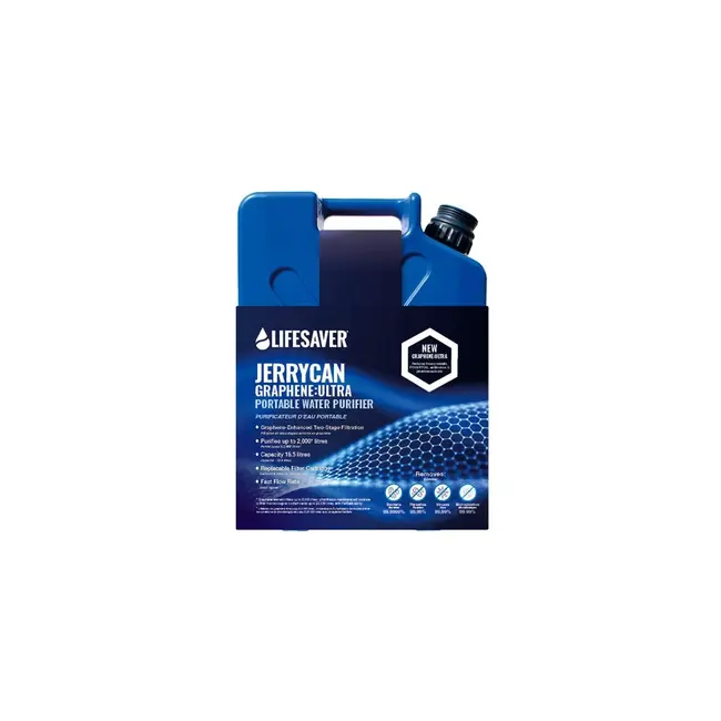 The Lifesaver Jerrycan Graphene:Ultra Blue takes portable water purification to the next level. While the standard Lifesaver Jerrycan excels at removing viruses, bacteria, parasites, and microplastics, this Graphene version adds exclusive graphene technology. This reduces PFAS (forever chemicals), heavy metals, antibiotics, and other chemical contaminants to safe levels. Ideal if you're camping in the Netherlands or Belgium in areas with potential industrial pollution, or in German forests and rivers where groundwater may contain heavy metals.