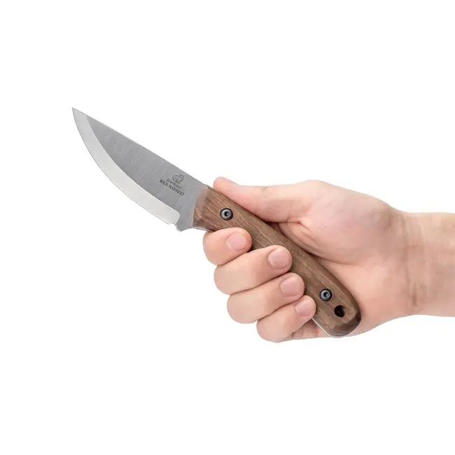 De full tang constructie van Het BSH7 Wild Harvest Bushcraftmes verhoogt niet alleen de sterkte, maar geeft ook vertrouwen in de betrouwbaarheid tijdens veeleisende taken. Het formidabele lemmet wordt aangevuld met een ergonomisch handvat van walnotenhout, dat een comfortabele en veilige grip biedt bij langdurig gebruik. Het uitgebalanceerde ontwerp van het handvat zorgt voor optimale controle en wendbaarheid in elke situatie.