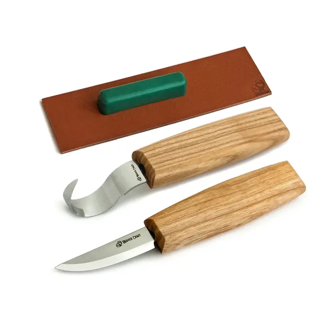De BeaverCraft S01 Lepel Houtsnijset is een houtsnijset waarmee je lepels kunt snijden. Hij bevat een lepelmes en een houtsnijmes. Daarnaast zit er een strop bij met compound, waarmee je de messen scherp houdt.