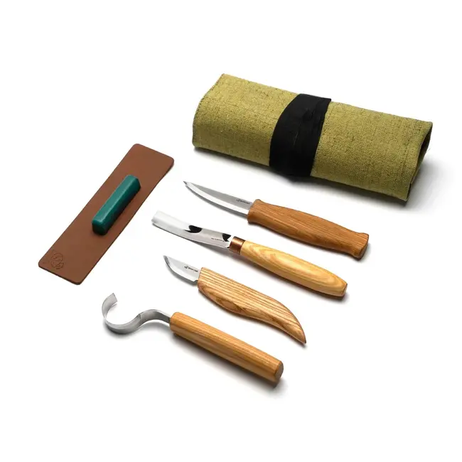 Dit is een professionele houtsnijset in canvas etui voor het snijden van lepels, kuksas, kommen. Incl. lepelmes, whittling mes, sloyd mes en gebogen guts. Lees meer.
